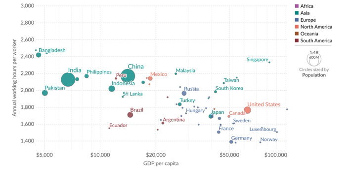 Arbeidstimer er det årlige gjennomsnittet per arbeider. BNP per innbygger er justert for inflasjon og forskjeller i livskostnader mellom land.