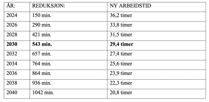 Legger vi gjennomsnittsestimatet til grunn, kan arbeidsuken bli forkortet med 641 minutter – altså 10,6 timer – innen 2040. Dette tilsvarer hele 65 arbeidsdager i året. Målet om en 30-timers uke vil i praksis være oppnåelig innen 2036.