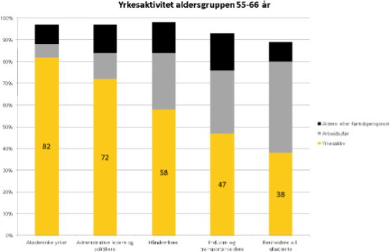 Faren for uanstendig lav levestandard i alderdommen rammer ikke tilfeldig. Tall Statistisk sentralbyrå har hentet ut for Manifest Tankesmie viser at avgangsmønsteret er sterkt «klassedelt» etter utdanning og status. Figuren viser store ulikheter mellom forskjellige yrkesgrupper når det gjelder andelen i aldersgruppen 55 til 66 år som er yrkesaktive, alderspensjonerte og uføre.