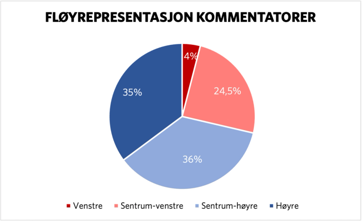 • Kommentatorer fra den sosialistiske venstresiden er særlig underrepresenterte. De står for kun 4 prosent av utvalget, til tross for at partiene i denne delen av politikken hadde 13 prosent oppslutning på meningsmålingene i den undersøkte perioden.