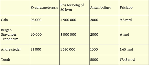 For å få et inntrykk av hva det vil koste, kan vi se for oss at det kjøpes 5000 leiligheter på 50 kvadratmeter i tre områder med ulik pris: Oslo, andre storbyer, og andre steder Gå til fotnote nummer 49.