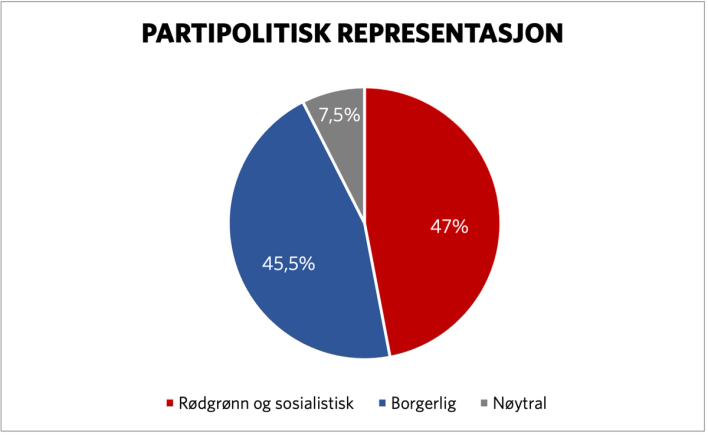 Den partipolitiske representasjonen varierer etter hvem som sitter i regjering. Under Erna Solbergs Høyre/FrP-regjering var borgerlige partier overrepresentert, mens den rødgrønne siden var overrepresentert under Jonas Gahr Støres AP/SP-regjering.